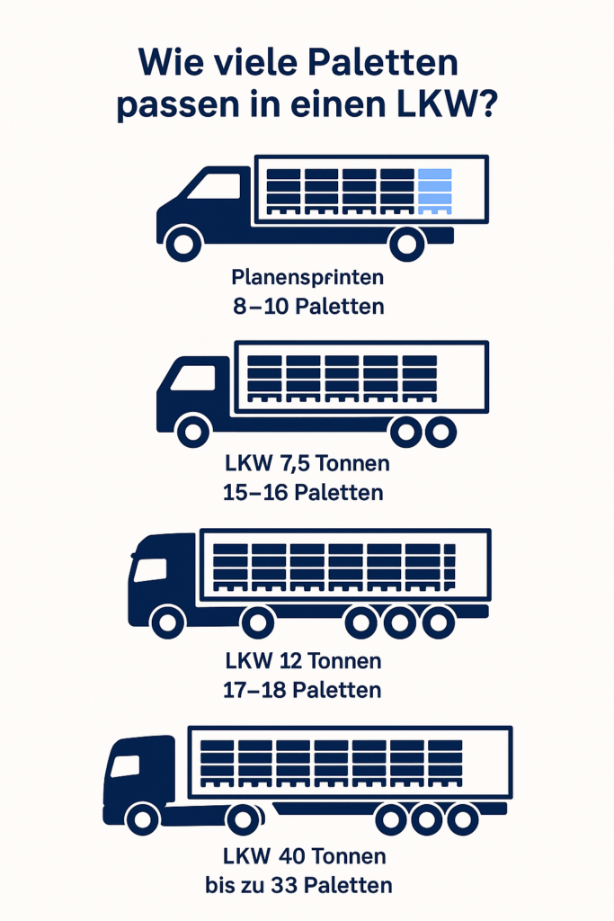 Ein Standard-40-Tonner kann je nach Aufteilung bis zu 33 Europaletten aufnehmen. Kleinere Fahrzeuge wie Planensprinter bieten meist 8 bis 10 Palettenplätze, während 7,5-t- und 12-t-LKW zwischen 15 und 18 Paletten transportieren können. Die genaue Kapazität richtet sich nach Ladeflächenmaßen und Palettengröße.