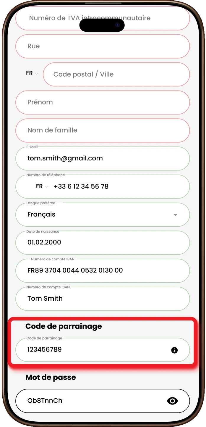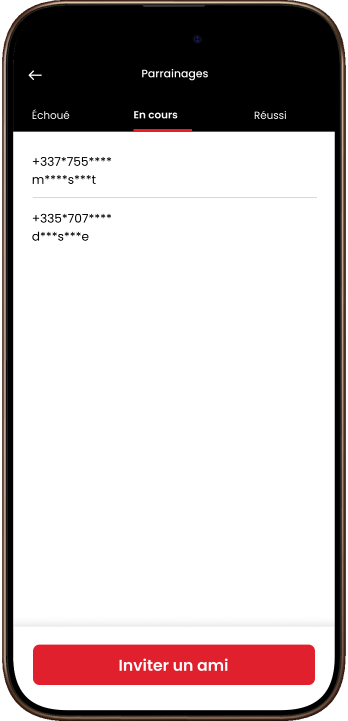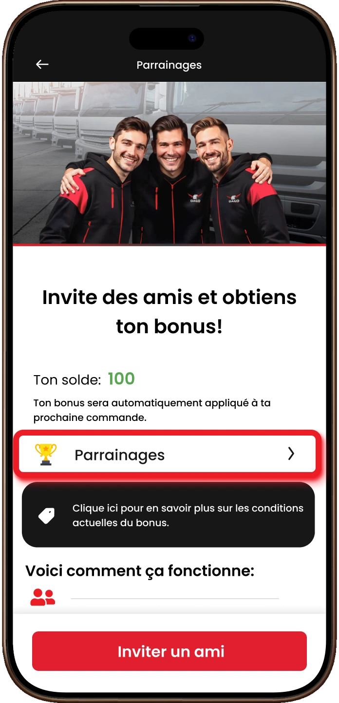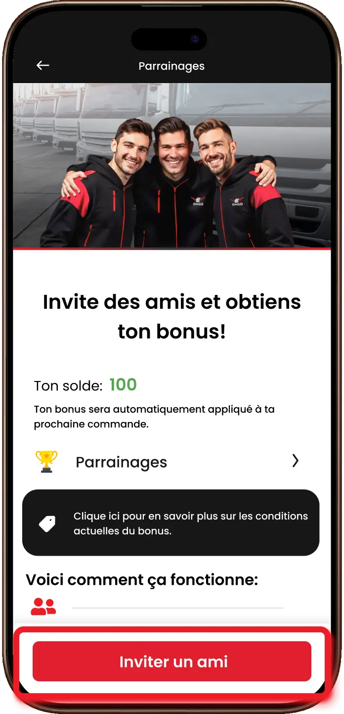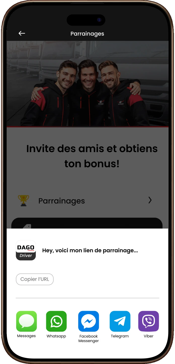 Choisis un ami et partage ton code via ton canal préféré – par exemple Messenger, WhatsApp ou e-mail. Lorsqu’il s’inscrit comme conducteur et atteint l’objectif, la récompense vous revient à tous les deux. Ton code est valable indéfiniment – il n’expire pas et peut être utilisé pour plusieurs parrainages !