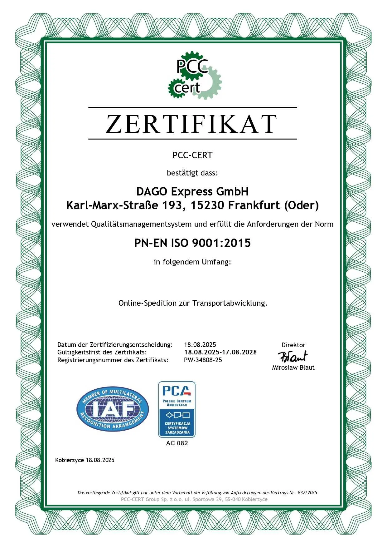 Das ISO-Zertifikat von DAGO Express wurde durch die PCC-CERT GROUP Sp. z o.o. ausgestellt – eine seit 2001 tätige, akkreditierte Zertifizierungsstelle mit nachweislicher Fachkompetenz im Bereich Managementsysteme.