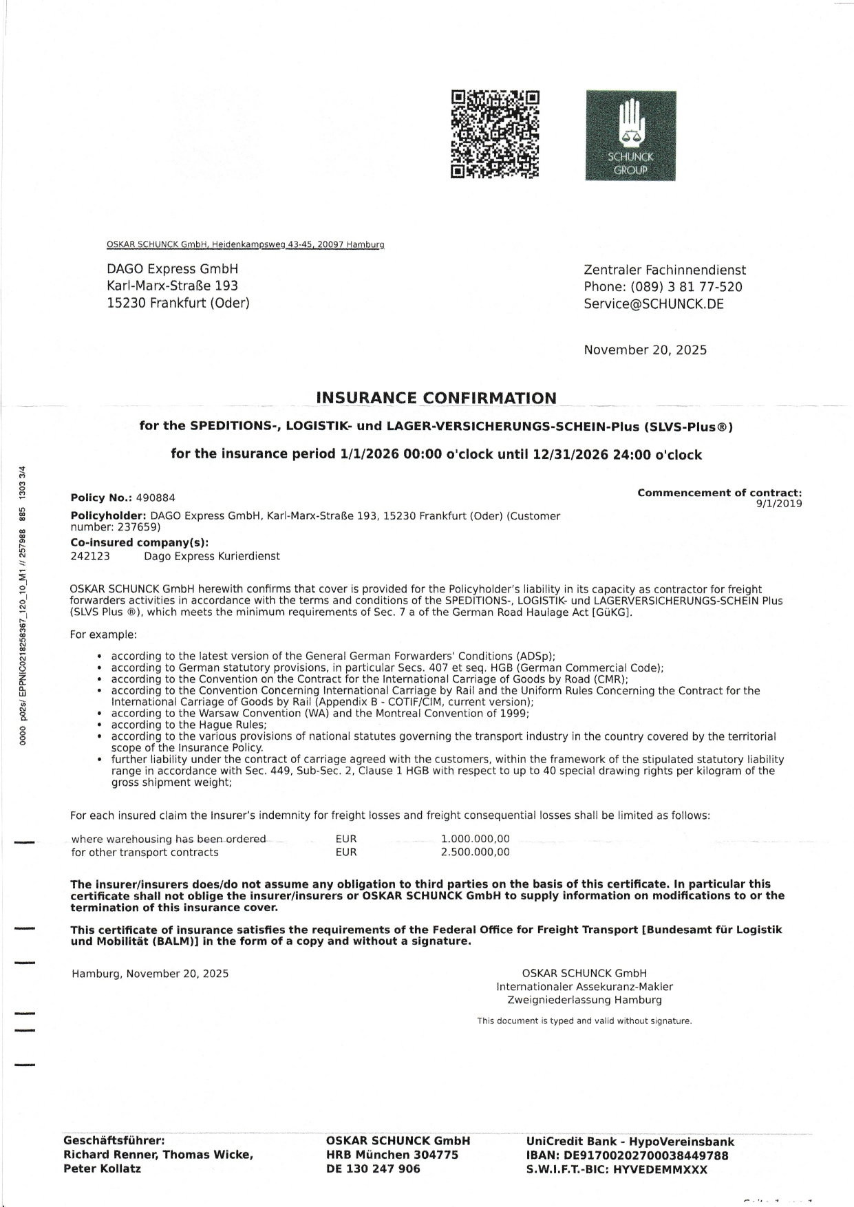 Il nostro obiettivo principale è guadagnare e mantenere la piena fiducia dei nostri clienti. Per questo motivo siamo orgogliosi di potervi presentare una prova affidabile della nostra assicurazione trasporti. Questa importante assicurazione è stata stipulata in collaborazione con il Gruppo Schunck, uno dei principali specialisti europei nel settore delle assicurazioni logistiche e dei trasporti. Fin dalla sua fondazione nel 1919, il Gruppo Schunck rappresenta qualità e affidabilità in questo settore.